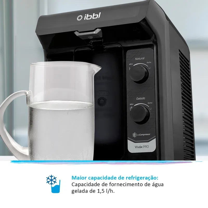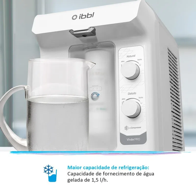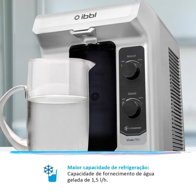Com alta capacidade de refrigeração e um design moderno e versátil, o Viváx Pro IBBL se adapta a qualquer ambiente, de lares a empresas. Capaz de atender a um grande fluxo de pessoas, este é o purificador de água ideal para quem busca uma solução prática e eficiente. Acompanhado do refil C+3 Max, possui ação de controle de proliferação de bactérias, retenção de impurezas da água, redução do cloro livre e eliminação de sabores e odores indesejados.